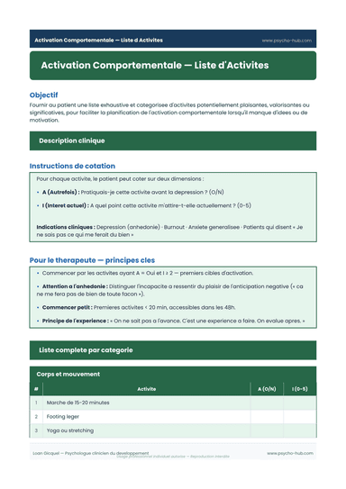 Liste exhaustive et catégorisée d'activités potentiellement plaisantes, valorisantes ou significatives pour faciliter la planification de l'activation comportementale chez les patients présentant une dépression ou un burnout.