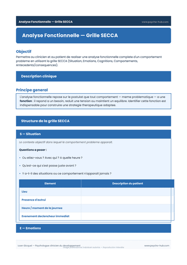 Outil d'analyse fonctionnelle complète utilisant la grille SECCA (Situation, Émotions, Cognitions, Comportements, Antécédents/Conséquences) pour comprendre les facteurs de déclenchement, de maintien et les contingences de renforcement d'un comportement problème.