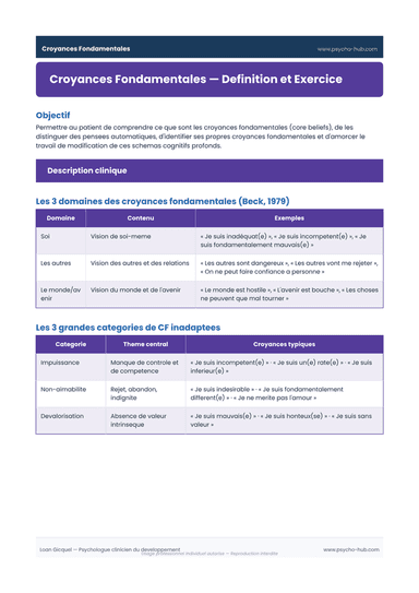 Outil d'identification et de première remise en question des croyances fondamentales (core beliefs) selon le modèle de Beck, distinguant les 3 domaines (soi, autres, monde) et proposant un exercice en 4 étapes.