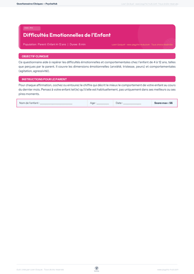Questionnaire parent de repérage des difficultés émotionnelles et comportementales de l'enfant de 4 à 12 ans (14 items, score max 56), couvrant les dimensions anxieuse, dépressive et comportementale avec grille d'interprétation à 4 niveaux.