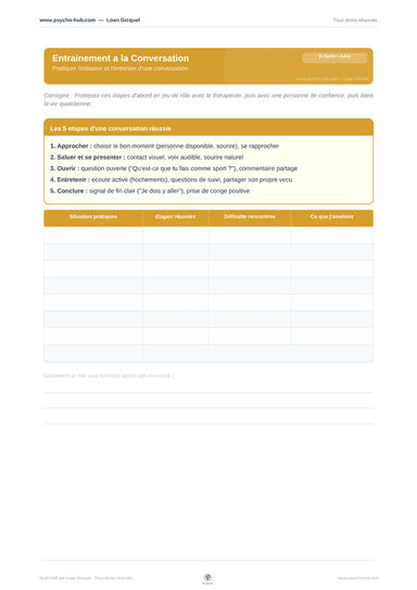 Grille de pratique des 5 étapes d'une conversation réussie pour enfants et adolescents en difficulté sociale, avec progression en jeu de rôle (thérapeute → personne de confiance → vie quotidienne) et tableau de suivi des situations pratiquées.