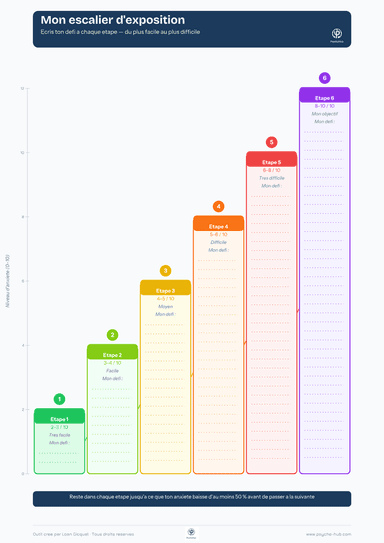 Présentation du principe de l'exposition progressive et construction guidée d'une hiérarchie d'exposition en 2 étapes (liste des situations évitées + organisation en échelle de 10 échelons).