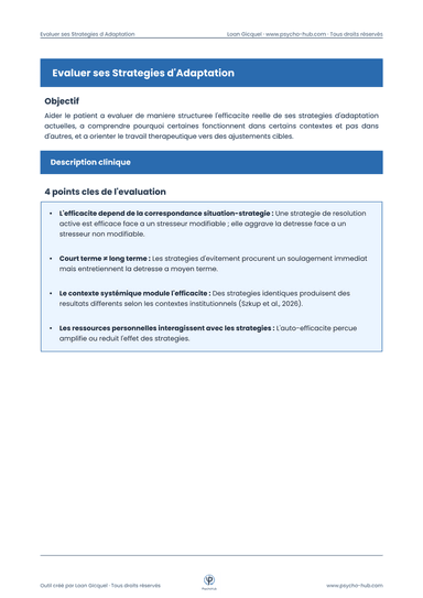 Distinguer les stratégies d'adaptation fonctionnelles des stratégies dysfonctionnelles, comprendre leur logique interne et orienter le travail thérapeutique vers le renforcement des stratégies protectrices.