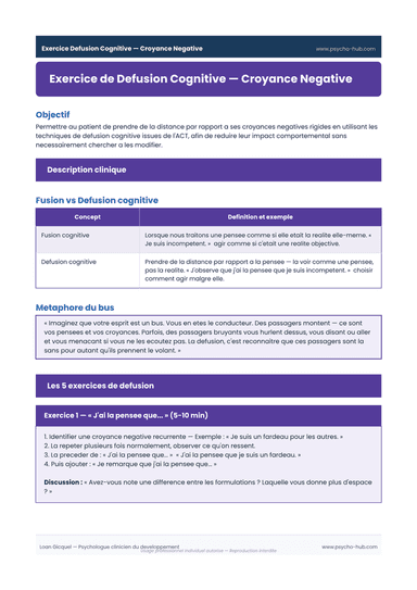 Exercice structuré en 5 techniques de défusion cognitive (ACT) pour réduire l'impact des croyances négatives rigides sur soi, les autres ou le monde, sans chercher à les modifier, applicable aux troubles anxieux, dépressifs et troubles de la personnalité.