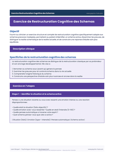 Version abrégée et accessible de la restructuration cognitive adaptée aux schémas (Young), utilisable en 15-30 minutes avec des patients en début de thérapie ou en format autonome entre séances.