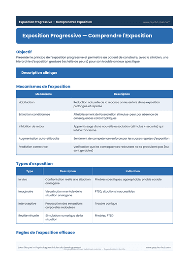 Présentation du principe de l'exposition progressive et construction guidée d'une hiérarchie d'exposition en 2 étapes (liste des situations évitées + organisation en échelle de 10 échelons).