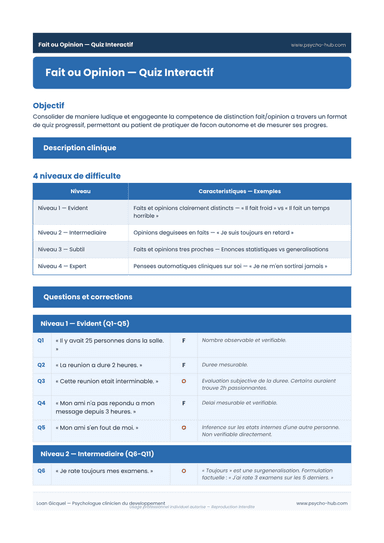 Quiz progressif en 20 questions réparties sur 4 niveaux de difficulté pour consolider de façon ludique la compétence de distinction fait/opinion, du niveau évident aux pensées automatiques cliniques.