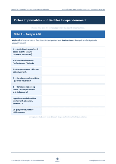 Fiche imprimable d'analyse ABC à remettre aux parents pour comprendre la fonction du comportement opposant de l'enfant, utilisable indépendamment entre les consultations.