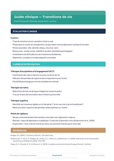 Fiche thérapeute pour accompagner les patients traversant des transitions de vie majeures (retraite, expatriation, reconversion), avec cadres d'intervention ACT, thérapie narrative et thérapie cognitive, et points de vigilance différentiels.