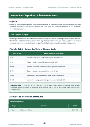 Guide clinique structuré pour construire une hiérarchie d'exposition graduée avec l'échelle SUDS (0-100), incluant des exemples concrets pour phobie des chiens, anxiété sociale, trouble panique et anxiété de séparation.
