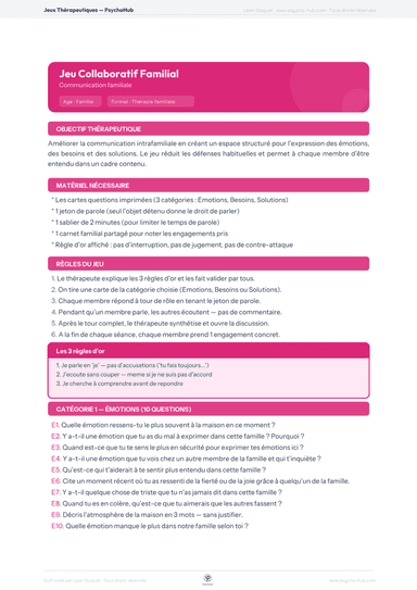 Jeu de cartes thérapeutique en 3 catégories (Émotions, Besoins, Solutions) pour améliorer la communication intrafamiliale en séance de thérapie familiale, structuré autour d'un jeton de parole et de 3 règles d'or.