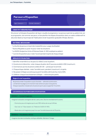 Jeu thérapeutique structurant l'exposition graduée en 8 niveaux progressifs (de l'exposition imaginaire au contact maximal réel), avec fiche de suivi SUDS avant/pendant/après chaque étape d'exposition.