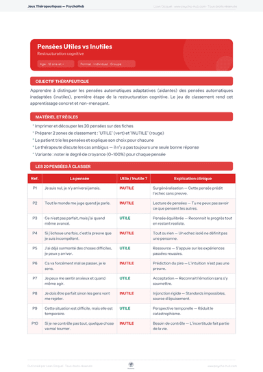 Jeu de classement de 20 pensées automatiques (utiles/inutiles/ambiguës) avec explications cliniques de chaque biais cognitif, pour initier la restructuration cognitive de façon concrète et non menaçante.