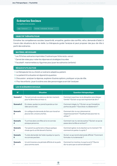 Jeu de 15 scénarios de la vie réelle pour entraîner les compétences sociales (assertivité, empathie, gestion des conflits, refus, demande d'aide) avec questions thérapeutiques et possibilité de jeux de rôle.