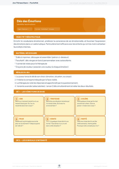 Jeu de 3 dés thérapeutiques pour enrichir le vocabulaire émotionnel : dé 1 (6 émotions de base), dé 2 (6 niveaux d'intensité), dé 3 (6 stratégies de régulation), particulièrement adapté aux patients ayant du mal à verbaliser leurs états internes.