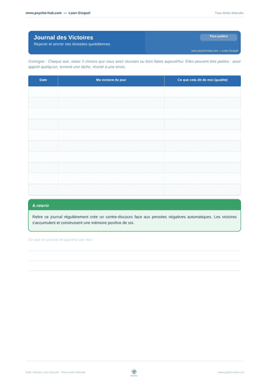 Journal quotidien pour noter 3 réussites du jour (grandes ou petites) avec la qualité personnelle associée, construisant un contre-discours face aux pensées négatives automatiques et une mémoire positive de soi.