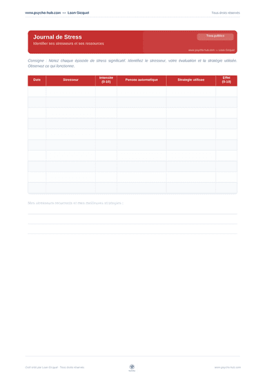 Grille d'auto-observation pour noter chaque épisode de stress significatif avec le stresseur, l'évaluation de l'intensité, la pensée automatique associée, la stratégie utilisée et son effet, pour identifier les patterns et les stratégies les plus efficaces.