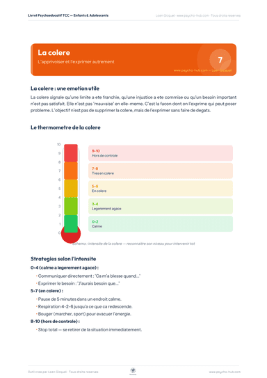 Fiche psychoéducative destinée aux enfants et adolescents pour comprendre la fonction adaptative de la colère, identifier son intensité grâce à un thermomètre émotionnel et apprendre des stratégies concrètes d'expression adaptée.