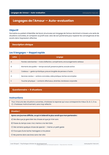 Questionnaire structuré en 8 situations permettant au patient d'identifier son langage de l'amour dominant parmi les 5 langages de Chapman, afin d'explorer les convergences et écarts d'expression affective au sein du couple.