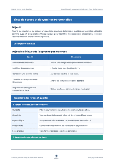 Répertoire structuré de 25 forces et qualités personnelles organisées en 6 catégories, accompagné d'un protocole d'exploration clinique en 4 étapes pour identifier les ressources disponibles, renforcer l'estime de soi et ancrer l'identité positive au-delà du trouble.