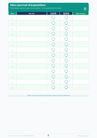 Outil de suivi rigoureux des séances d'exposition progressive permettant au patient de planifier, réaliser et documenter ses expositions avec mesure des niveaux d'anxiété avant, pendant et après chaque session.