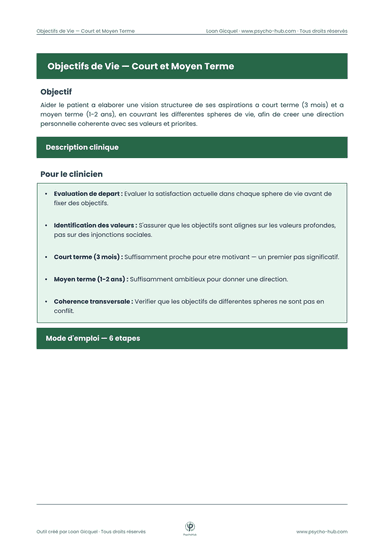 Outil de planification en 6 étapes (roue de vie, objectifs à 3 mois, vision à 2 ans, visualisation, cohérence valeurs-objectifs, plan d'action 30 jours) pour aider le patient à élaborer une direction personnelle cohérente avec ses valeurs à travers les différentes sphères de vie.