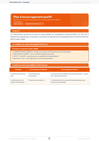 Outil parental basé sur le renforcement positif (ABA/Kazdin) pour les enfants de 4-12 ans, présentant la formule d'encouragement efficace en 3 parties (comportement observé + émotion du parent + effet/valeur) et un journal hebdomadaire pour atteindre un ratio optimal de 5 interactions positives pour 1 corrective.
