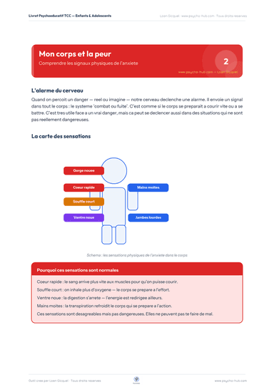 Aider les enfants et adolescents à identifier et comprendre les manifestations physiques de l'anxiété (réaction combat-fuite), pour les dédramatiser et permettre une meilleure reconnaissance des signaux corporels.
