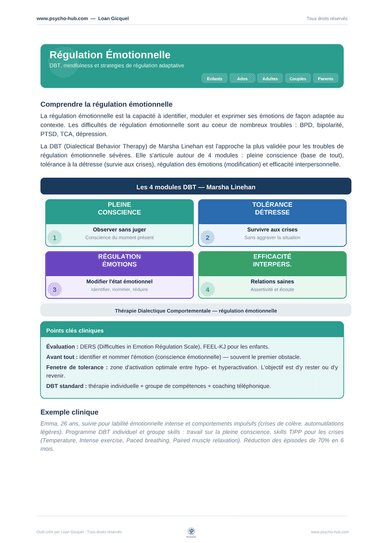 Fiche clinique de référence sur la régulation émotionnelle : approche DBT de Linehan (4 modules), fenêtre de tolérance, évaluations recommandées, et exemple d'intervention pour les troubles de la régulation sévères.