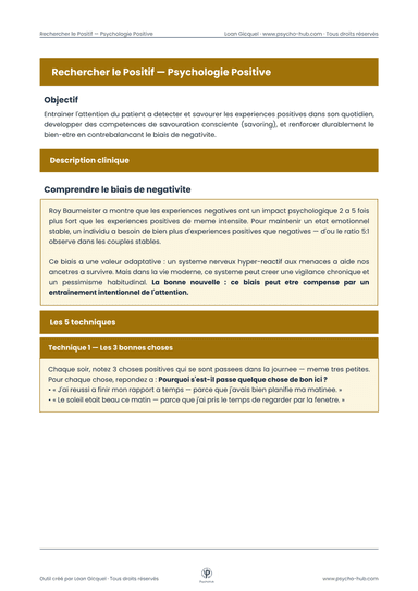 Outil de psychologie positive combinant 5 techniques (3 bonnes choses, savoring, flux, journal de réussites, photographie mentale) pour contrebalancer le biais de négativité et renforcer le bien-être.