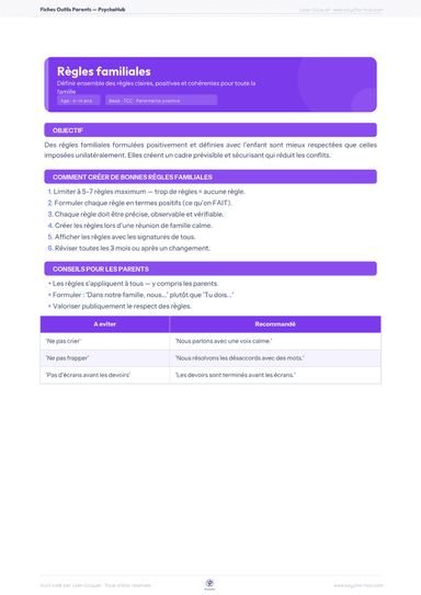 Outil parental pour co-construire avec l'enfant des règles familiales formulées positivement, précises et observables, afin d'établir un cadre prévisible et réduire les conflits.