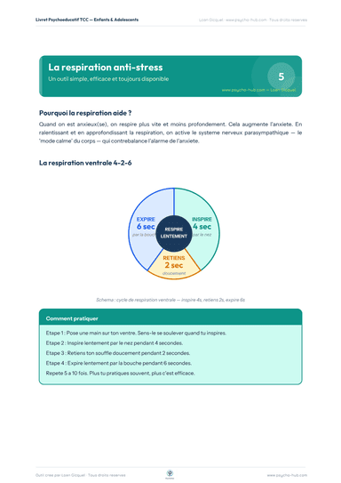 Outil de régulation du stress par la respiration ventrale 4-2-6 pour enfants et adolescents, avec explication du mécanisme parasympathique et suivi d'entraînement hebdomadaire.