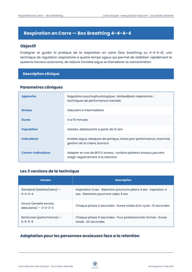 Guide clinique de la respiration en carré (box breathing) avec 3 variantes selon le niveau, animation visuelle par tracé du carré, et protocoles adaptés aux contextes (anxiété aiguë, insomnie, performance, colère).