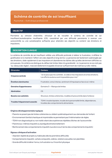 Outil clinique pour identifier et travailler le schéma de contrôle de soi insuffisant (CS), caractérisé par une difficulté persistante à exercer un autocontrôle suffisant — tolérance à la frustration, différer la gratification, maintenir l'effort — avec un protocole centré sur le travail comportemental.
