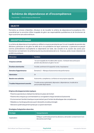 Outil clinique pour identifier et travailler le schéma de dépendance/incompétence (DI), caractérisé par la conviction d'être incapable de gérer ses responsabilités quotidiennes sans aide extérieure, avec un protocole centré sur le renforcement progressif de l'autonomie.