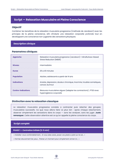 Script clinique combinant la relaxation musculaire progressive de Jacobson avec les principes de la pleine conscience (MBSR), pour induire une relaxation corporelle profonde tout en développant une conscience non-jugeante des sensations physiques. Niveau intermédiaire, 25-40 minutes.