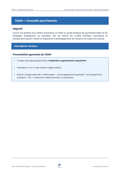 Fournir aux parents d'un enfant TDAH un guide de psychoéducation et de stratégies d'adaptation au quotidien pour réduire les conflits familiaux, améliorer la collaboration parent-enfant et optimiser le développement.