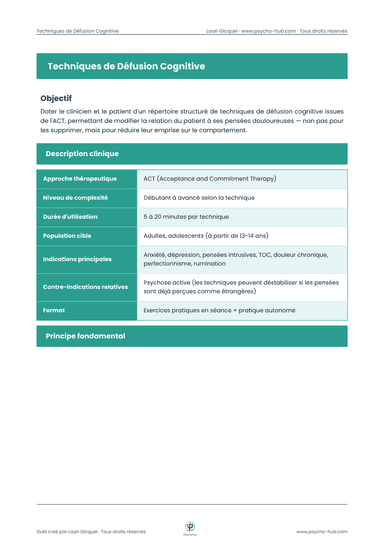 Doter le clinicien et le patient d'un répertoire de 10 techniques de défusion cognitive issues de l'ACT pour modifier la relation aux pensées douloureuses, non pas pour les supprimer mais pour réduire leur emprise sur le comportement.