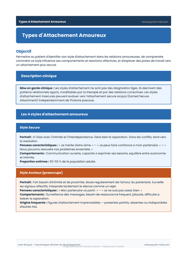 Permettre au patient d'identifier son style d'attachement dans les relations amoureuses (sécure, anxieux, évitant, désorganisé), comprendre comment ce style influence ses comportements et explorer des pistes de travail vers un attachement plus sécure.