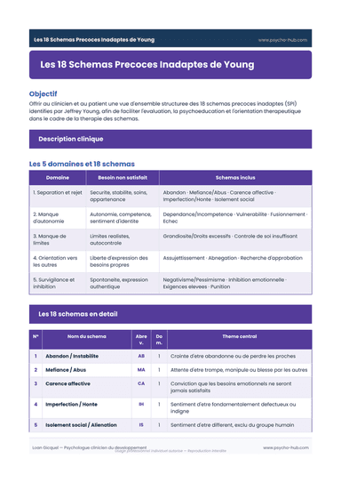 Vue d'ensemble structurée des 18 schémas précoces inadaptés (SPI) de Jeffrey Young organisés en 5 domaines, avec leurs thèmes centraux, un mode d'emploi clinique en évaluation, psychoéducation et suivi, et le fondement scientifique de la thérapie des schémas.