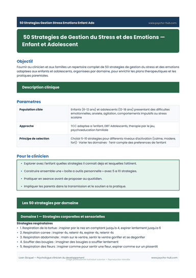 Répertoire complet de 50 stratégies de gestion du stress et des émotions adaptées aux enfants et adolescents, organisées en 6 domaines (corporel, mouvement, créatif, cognitif, social, distraction), avec un guide pour construire une boîte à outils personnelle.