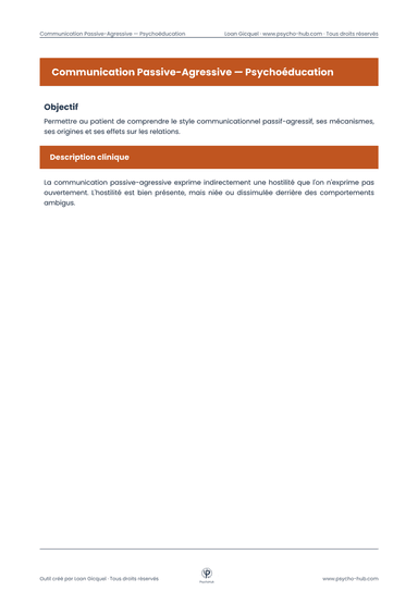 Fiche psychoéducative sur le style de communication passive-agressive : mécanismes, comportements types avec significations réelles, origines psychologiques et pistes vers une communication directe.