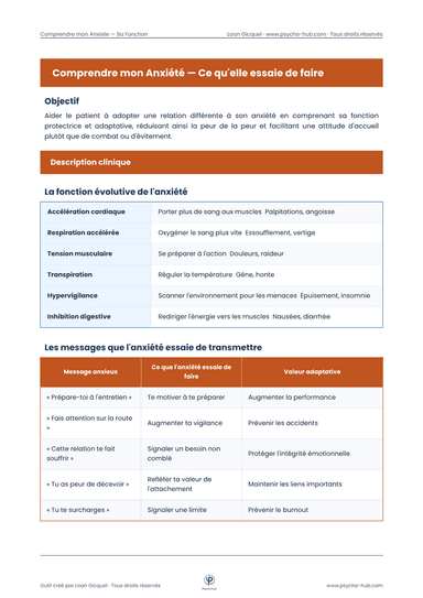 Fiche psychoéducative expliquant la fonction évolutive et adaptative de l'anxiété, ses mécanismes physiologiques, et proposant des exercices pour développer une relation d'accueil plutôt que de combat face aux symptômes anxieux.