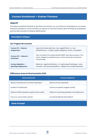 Outil de monitoring de l'humeur sur un continuum visuel avec 3 types de curseurs (1D, 2D, bipolaire), protocoles de check-in en séance et de suivi quotidien, adapté au suivi de la dépression et des troubles de l'humeur.