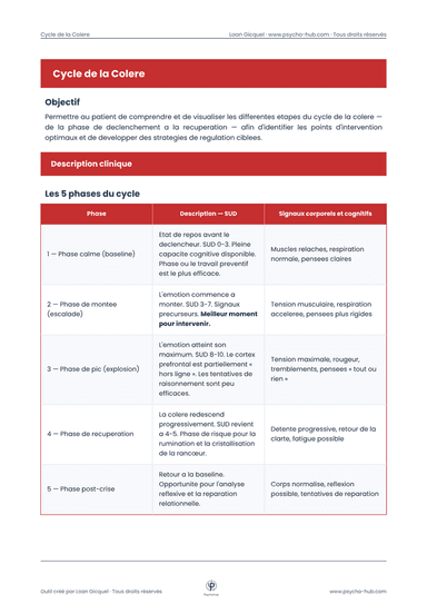 Outil de psychoéducation et d'intervention sur les 5 phases du cycle de la colère (Novaco), permettant au patient d'identifier ses signaux d'alarme précoces et de développer un plan de gestion personnalisé par phase.