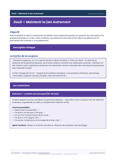 Exercice thérapeutique structuré en 4 étapes pour transformer la relation avec la personne perdue, passant de la présence physique à un lien continu intérieur, inspiré de la thérapie narrative du deuil (Neimeyer) et de la théorie des liens continus (Klass).