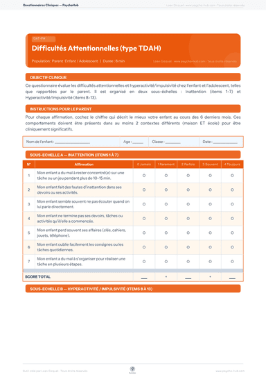 Questionnaire parent de repérage des difficultés attentionnelles et hyperactivité/impulsivité de type TDAH chez l'enfant et l'adolescent, organisé en deux sous-échelles : Inattention (7 items) et Hyperactivité/Impulsivité (6 items).