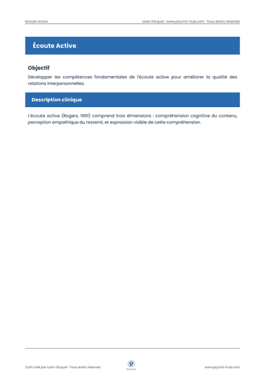 Fiche psychoéducative présentant les 4 dimensions de l'écoute active (Rogers), les 7 obstacles fréquents et les 6 techniques clés, avec 3 exercices progressifs pour développer cette compétence relationnelle fondamentale.