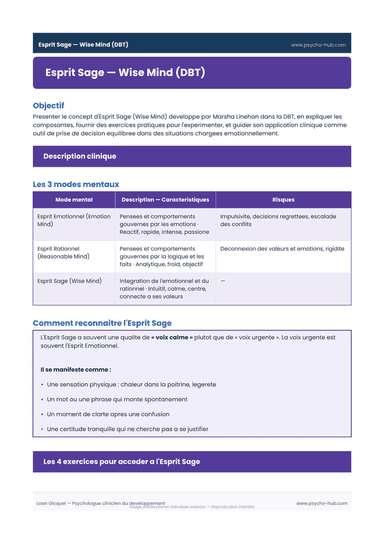 Présentation du concept d'Esprit Sage (Wise Mind) issu de la DBT de Linehan, avec les 3 modes mentaux, 4 exercices pratiques pour y accéder et les applications cliniques dans la prise de décision et la gestion des comportements impulsifs.