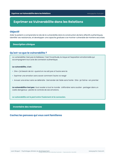 Outil pour aider le patient à comprendre le rôle de la vulnérabilité dans les liens authentiques, identifier ses résistances et développer une capacité graduée à se montrer vulnérable de façon sécurisée.